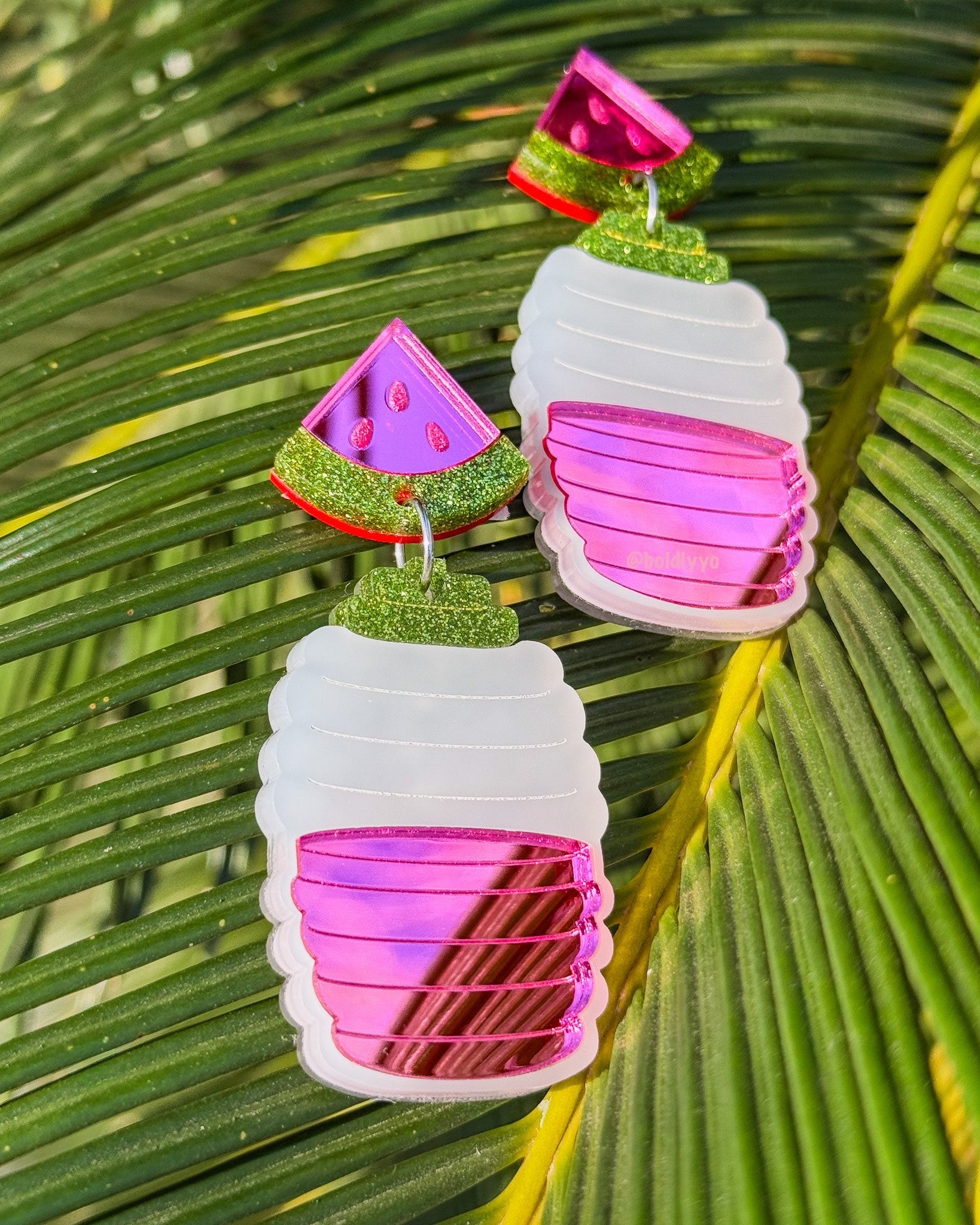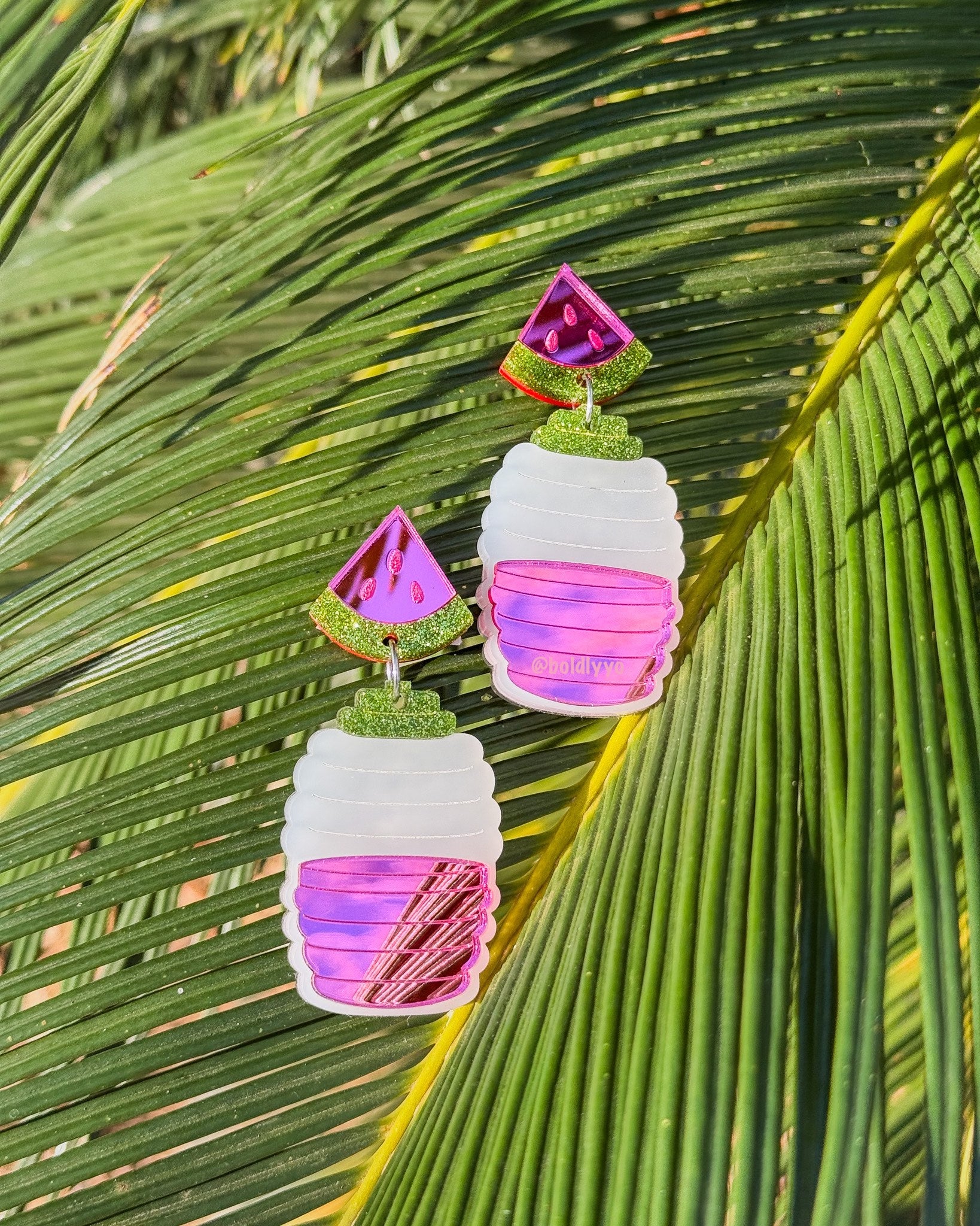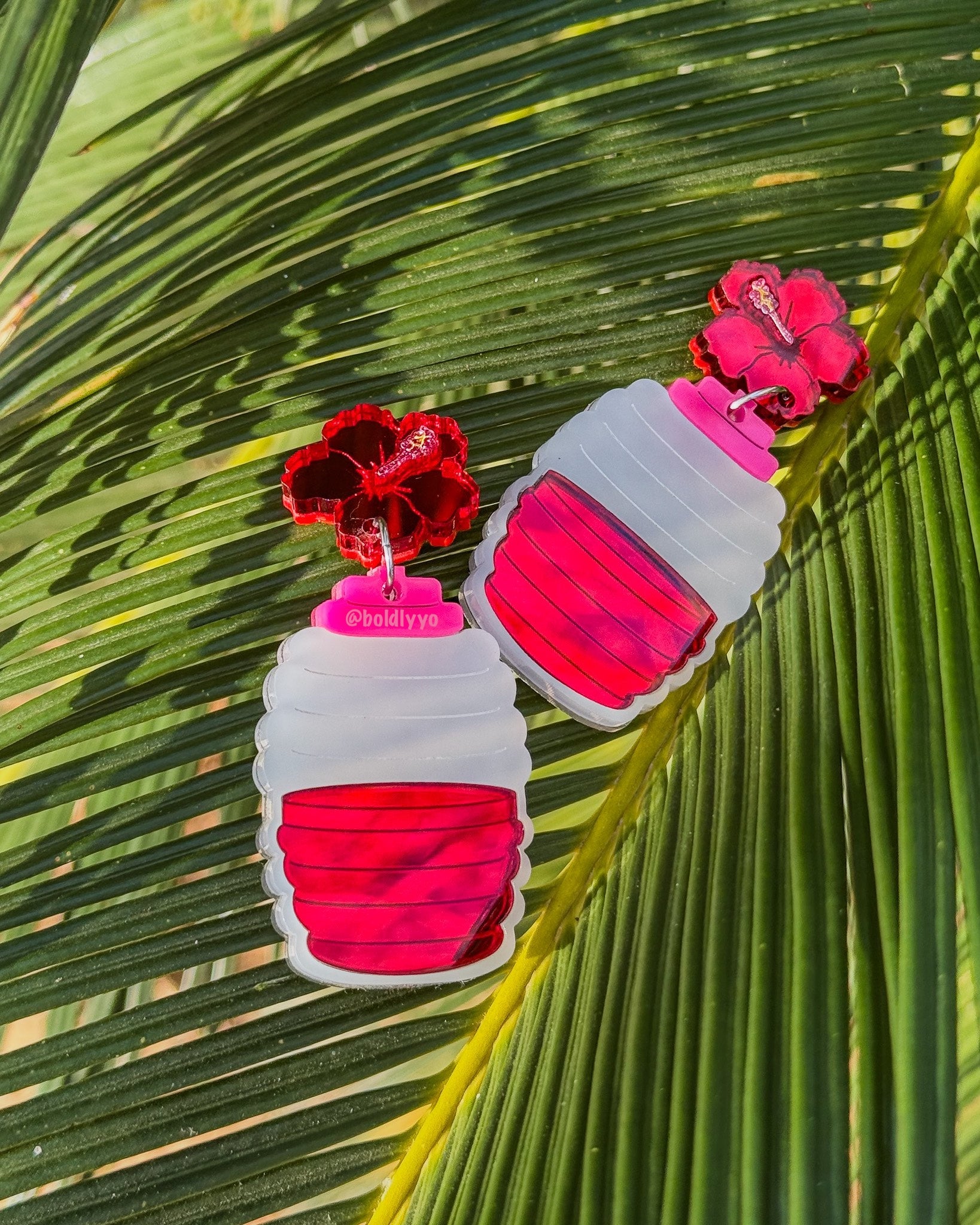 Refresh your ears! 3 cute statement earrings in pink Agua de Sandia, red Agua de Jamaica, and yellow Lemonade acrylic accompanying frosted acrylic mimicking the iconic vitroleros.
