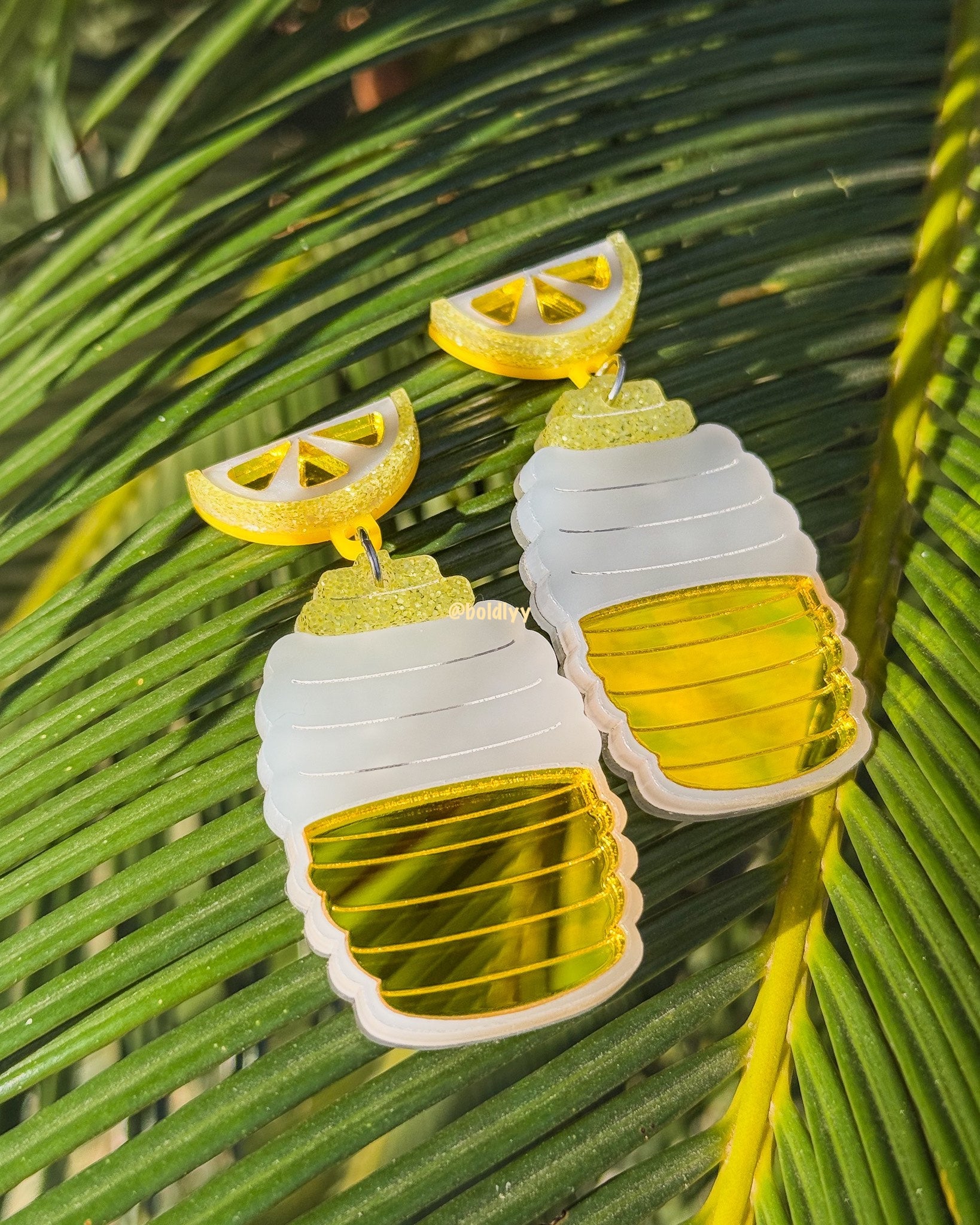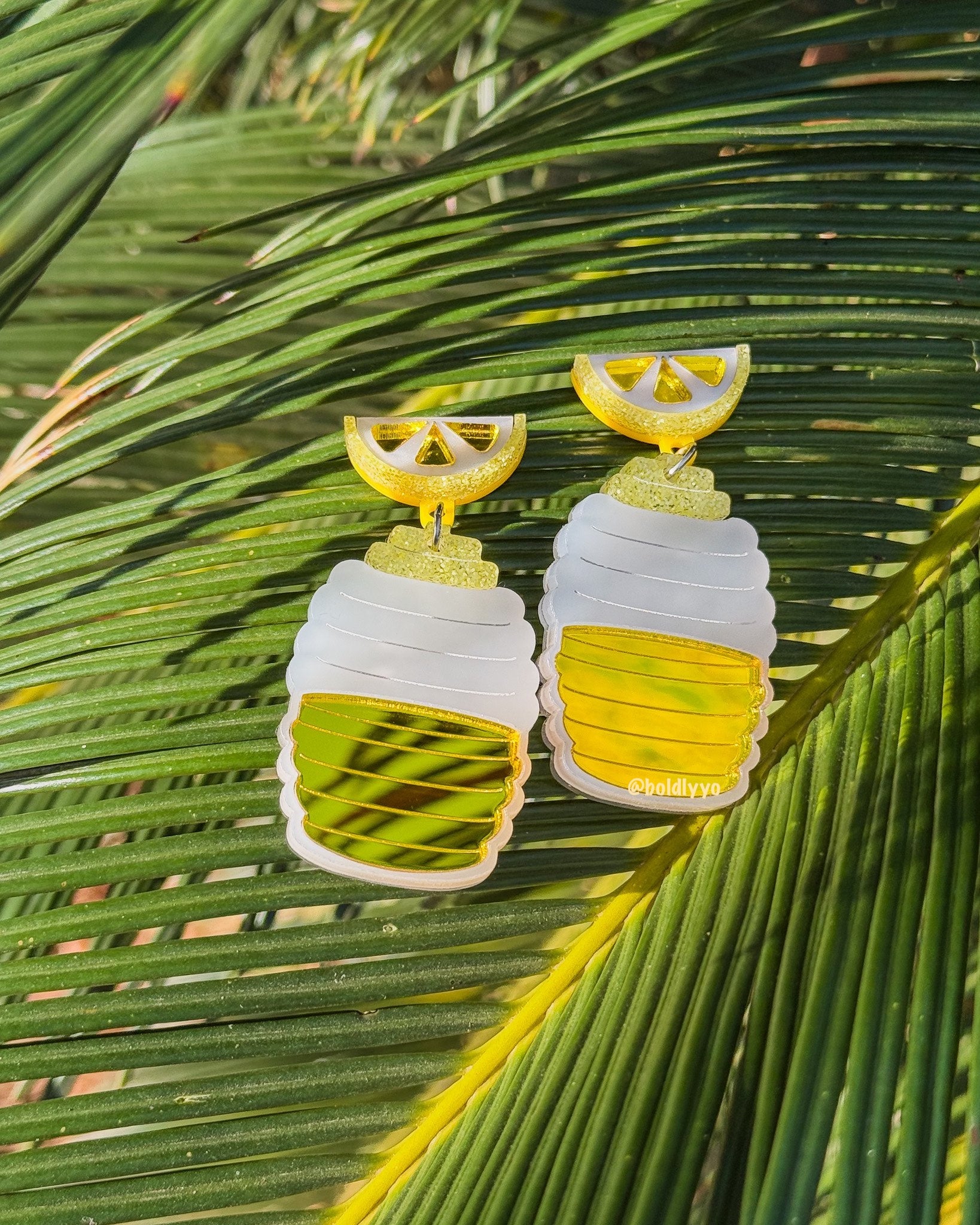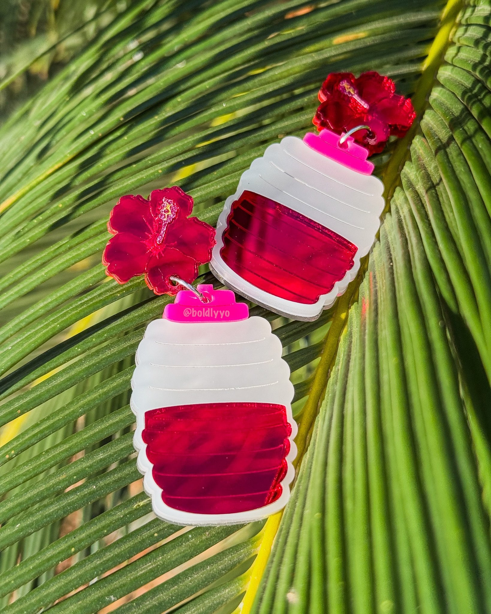 Refresh your ears! 3 cute statement earrings in pink Agua de Sandia, red Agua de Jamaica, and yellow Lemonade acrylic accompanying frosted acrylic mimicking the iconic vitroleros.